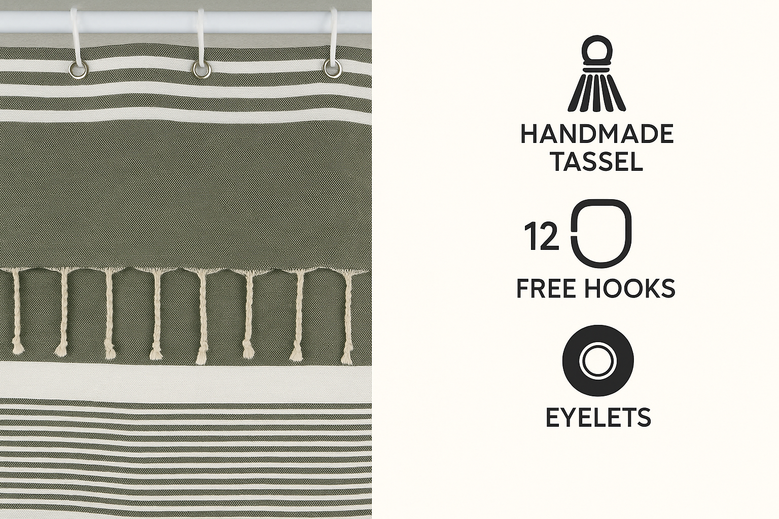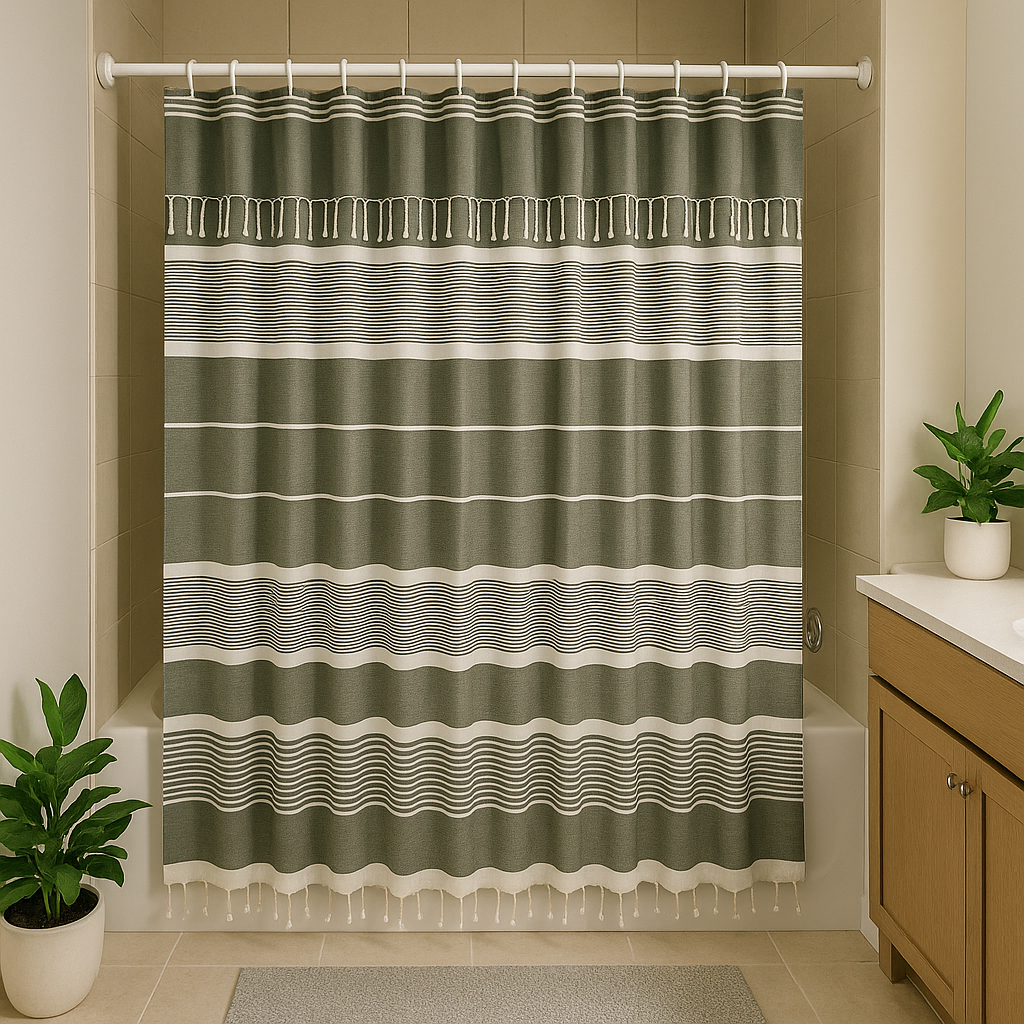 Khaki Green Cotton Shower Curtain with Tassels – 79" x 71" – Boho & Farmhouse Style – Quick Dry, Multi-Purpose, Free Hooks