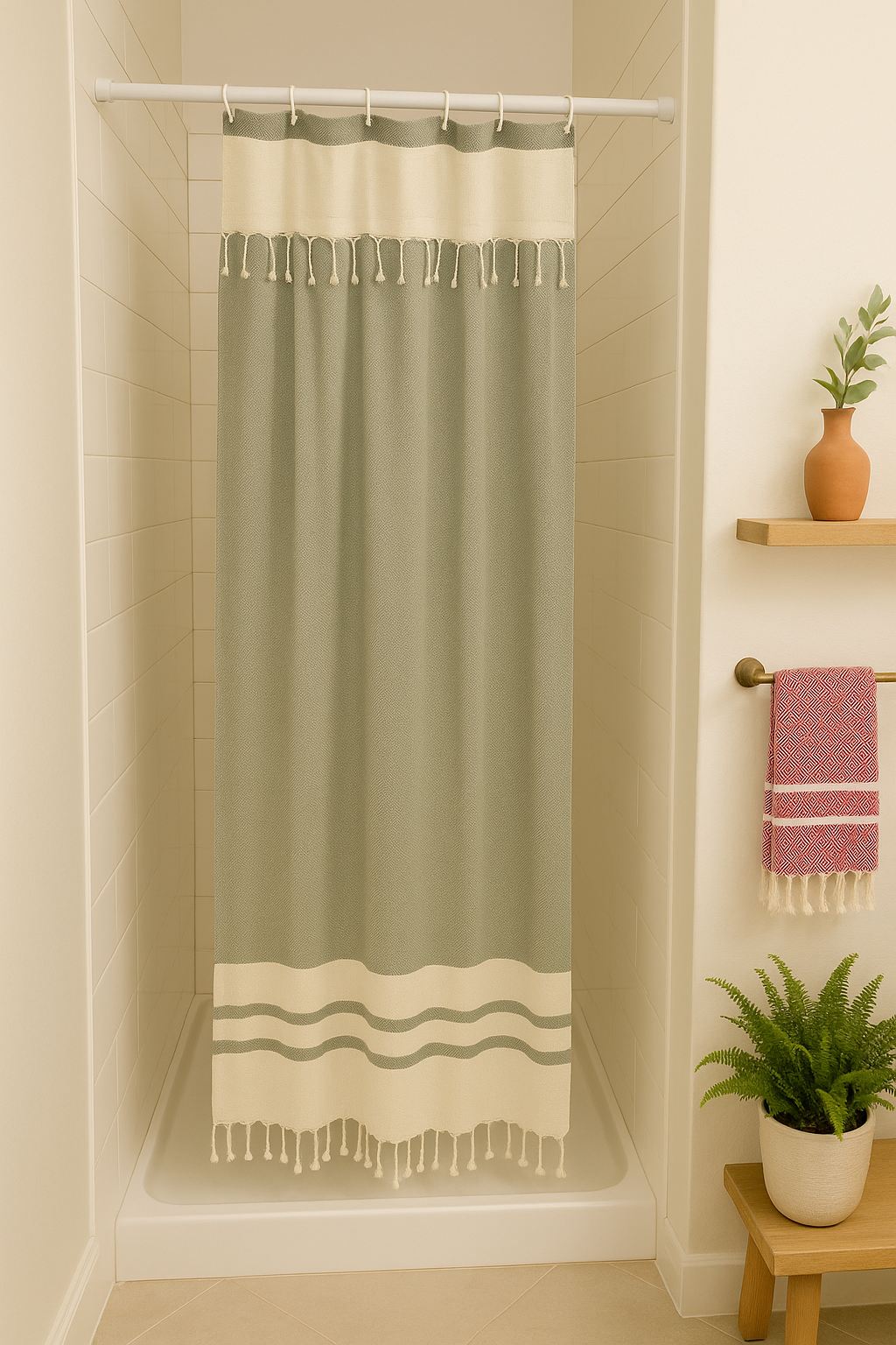 Transform your small shower into a refreshing retreat with this Khaki Green stall shower curtain. Crafted from 100% breathable cotton, it offers a soft drape, quick-dry performance, and a naturally elegant look with handmade tassels.